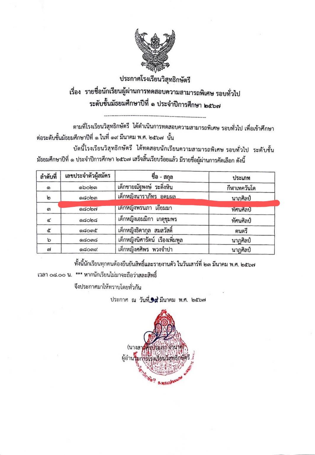 ยินดีกับน้องจีน สอบติดพิเศษรำไทย โรงเรียนวิสุทธิกษัตรี